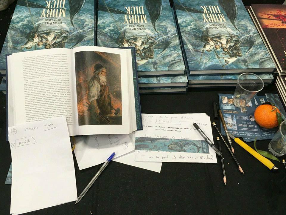 Конец 2017 года оказался для меня полон ярких событий и впечатлений. Как я уже тут писал, французское издательство «SARBACANE» выпустило книгу «Моби Дик» с моими иллюстрациями, и по этому поводу в рамках презентационных мероприятий пригласило меня во Францию. Двухнедельная поездка вместила в себя огромное число впечатлений, знакомств и событий. А самое главное то, что наша книга — это настоящий успех издательства, ну и мой вслед за этим. В этом я смог лично убедиться и на многочисленных «дедикасах» (встречи с покупателями книг и автограф-сессии) в крупнейших книжных магазинах Парижа, Рамбуйе, Анонне, а в заключении поездки и на крупнейшей французской книжной ярмарке в Монтрё. Во многих магазинах были устроены выставки иллюстраций из «Моби Дика». Я лично познакомился со всеми сотрудниками издательства «SARBACANE», с некоторыми из которых я был знаком лишь заочно, со многими французскими авторами и художниками. Я провел день на стенде с замечательной парижской художницей, за работой которой давно с удовольствием слежу — Ребеккой Детример, а после побывал у нее в доме и в мастерской. Это не говоря уже о музеях Парижа, туристических достопримечательностях и общих впечатлениях от Франции и Парижа. В нескольких газетах, начиная с Ле Монд, и журналах вышли статьи посвященные нашему «Моби Дику», с самыми благожелательными отзывами… Я полон впечатлений и планов. Немного фотографий покажу и вам. |